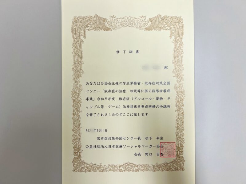 依存症回復支援については、医療ソーシャルワーカーの職能団体である日本医療ソーシャルワーカー協会が中心となって研修を行っています。