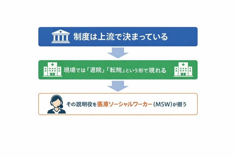日本の医療制度は、国や都道府県という“上流”で、医療計画を通じて決められています。一方で、“下流”にあたる医療現場では、それらの前提条件が「退院」「転院」といった具体的な出来事として現れます。
